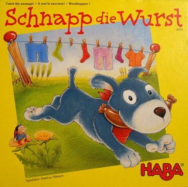 Schnapp die Wurst (Catch the Sausage) Game idea: The dogs are sniffing and running along the washing-line. Next to the sock there is a deliciously smelling sausage! Whoever is lucky with the dice and gives a bit of thought to pulling of the line, will have their dog standing in the right moment directly underneath the sausage card and collect many...