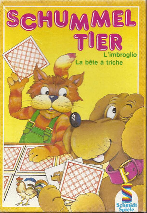 Each player has a little board with 3 x 3 squares which show three roosters, three cats and three dogs. There are individual square tiles face-down on the table. The player whose turn it is picks up one tile, looks at it and places it face-down on one square of his/her board, claiming it is on a matching animal. If another player doubts that, he or she can...