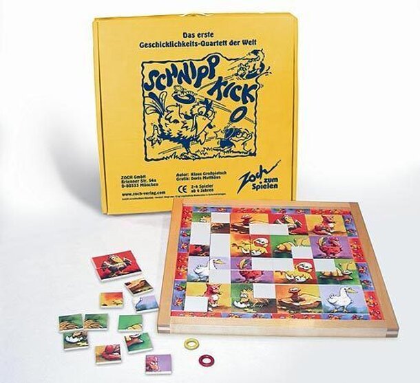 "Schnipp Kick" is a turbulent skills quartet. There are 16 pictures of animals arranged in a generous wooden frame. All the 16 animal pictures consist of four single square pieces that can individually be taken out of the frame. From each corner of the wooden frame, a player flips his wooden ring across the pictures and takes the quarter of the animal...