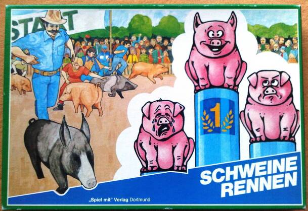 A roulette variant with pig motifs on the bidding cards and on the roulette wheel. Each player has 4 cards in hand, with one suit and one pig position, he can bid up to four suits. Then the wheel is spun, for the winning color with matching pig position there is a winning pig and the bet card, for the right color with wrong pig there is a triple chance...