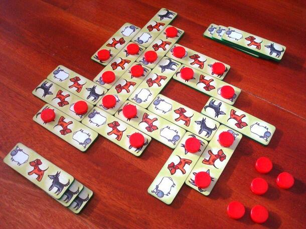 Sheep, Dogs and Wolves, invented by Néstor Romeral Andrés and his daugther Elena (at age 4), is a tile-laying game for two players (sheep and wolf) who share a common pool of rectangular pieces depicting a sheep, a dog and a wolf, in that order. The sheep player must save as many sheep as possible, while the wolf must feast on those sheep. Chomp! Sheep...