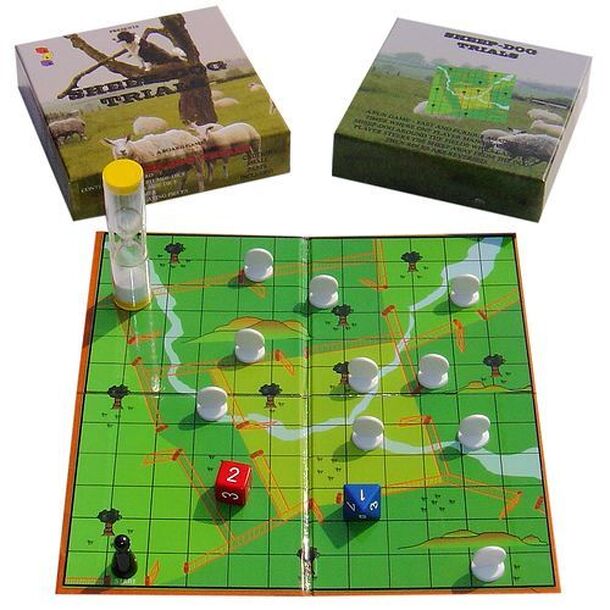 Sheep-dog Trials is a compact and unique little boardgame (using a 12x12 grid playing area) where players are competing with each other and a timer. Each player attempts to round up as many sheep as possible against the clock - whilst the sheep attempt to keep out of the dog's reach. The sheep can jump the fences but the dog must go through the gate! Then...