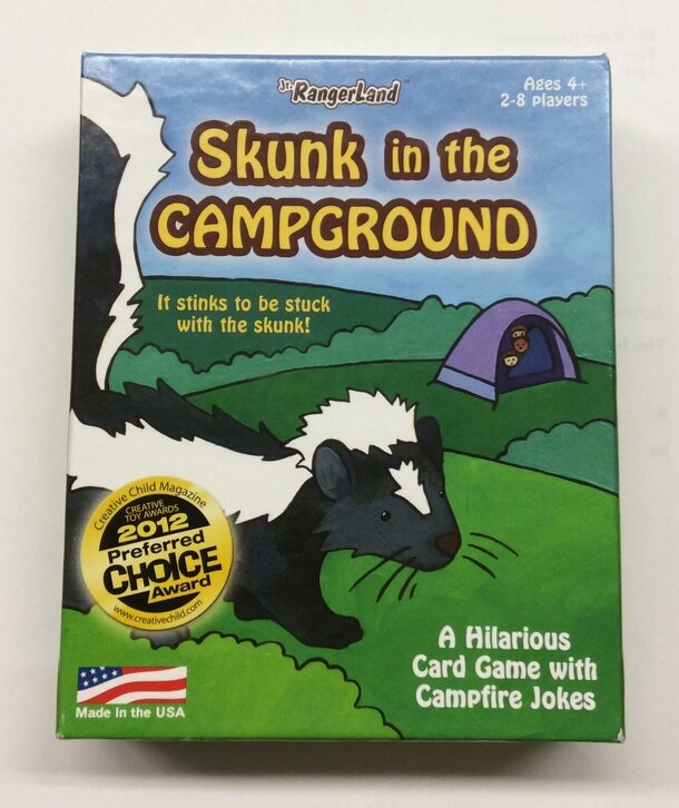 Outer Box Description: In this hilarious game, players draw cards and match pairs. But beware! If the skunk sneaks into your hand, you lose the game. The cards are filled with funny jokes and fun animal facts to share around the campfire. Setup: Shuffle the Deck. Deal out the cards one at a time to all of the players. Some players may get an extra card....