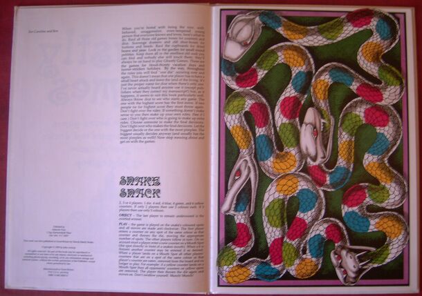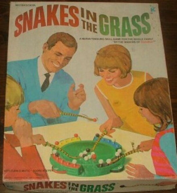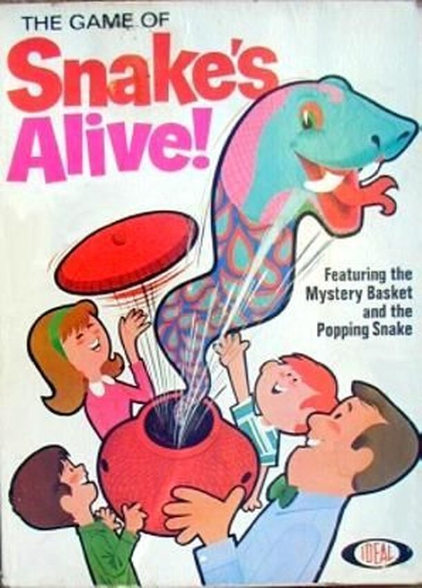 This game is best played in a largish area with the competitors sitting in a circle on the floor. A plastic basket containing a coiled 'snake' is placed in the center of the players. The 'snake' consists of a large, material-covered spring with a plastic head on one end. The basket has a number of holes, one of which will activate the latch on the basket...
