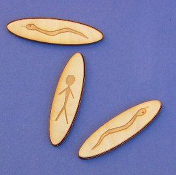 This is a press your luck game with components based on a Native American game called the Stick Game. With the new rules it is similar to the dice game Pig Dice. Players toss the sticks. Each snake that is shown on the result of a toss counts as a point. A player can stop tossing and store those points or toss again. If the player ever gets a "snakebite"...