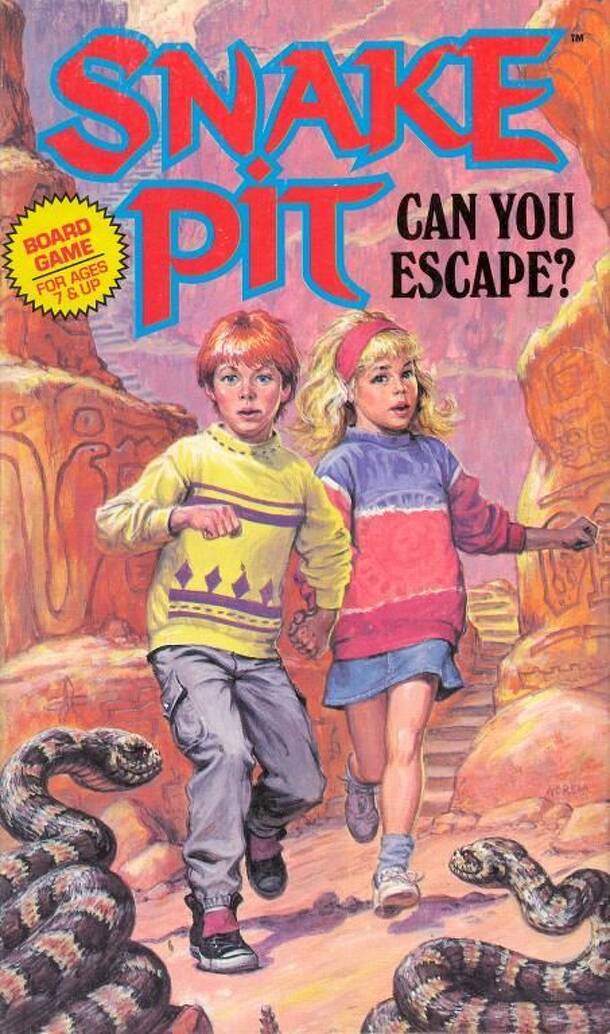 Snake Pit Can you escape? Board Game Ages 7 and up 2 - 4 players Playing board 10½" x 10½" Object of the game: Be the first to collect all five weapon tokens (rope, gun, stones, whip, and plank of wood) and escape from the snakepit. This game comes in a small box. The board is 6 pieces that fit together like a jigsaw. Also included are one die, 12 stands...