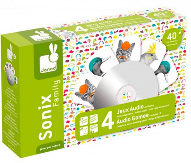 80 cards with 40 animals and one Audio CD. The games of Sonix series are specifically designed to promote the following skills in your child: perception, discernment, acoustic memory, logic, observation and language skills. Before the game must be activated the random play function on the CD player to listen to each round a new track. Some games are old...