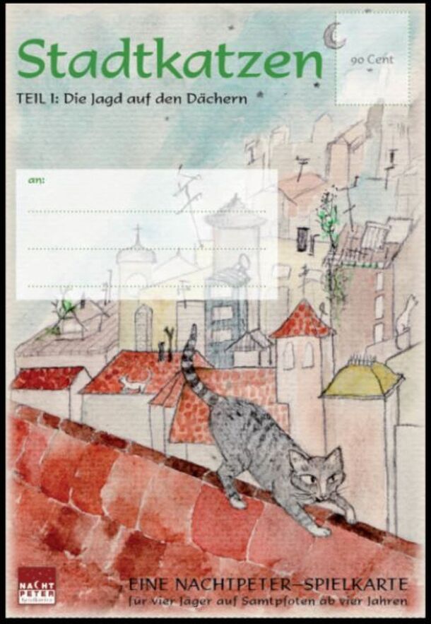 From the publisher (translated): In this Pachisi-style game, players roll the dice and move their pawns in a circle. The track goes around the roofs of an old city quarter. For the four main characters of the game, this is both home and hunting ground. The town cats hunt mice, lose them again and steal them from each other. With the luck of the dice...