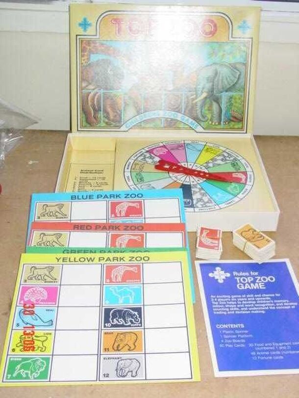 From Box "An exciting game of chance and skill for young children six years and upwards who try to have the "Top Zoo" by being the first to fill all the enclosures on their playing boards with animals. Top Zoo incorporates in its play the elements of chance through the twirling of a spinner and luck by the use of fortune playing cards. The game also...
