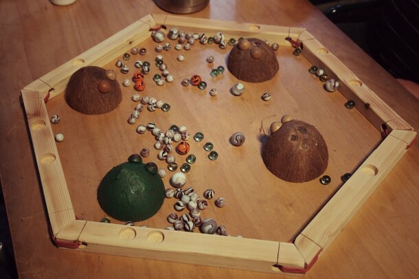 Topfrosch consists of a wooden frame, four frogs (made from coconut halves), a sand timer, and 160 marbles in four colors. Marbles represent the insects that the frogs want to catch. Set the frame on the table, place the marbles inside, then flip the sand timer. Each player grabs his frog and pushes it through the arena, trying to get as many marbles as...