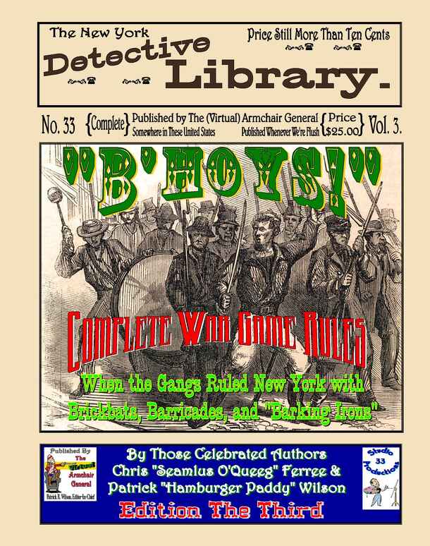 From the web-site: B'hoys! is a detailed game system based entirely upon Herbert Asbury's The Gangs of New York. Emphasizing the fluid nature of mob vs. mob street-fighting, and the dynamics of such contests, the rules use specially designed Action Cards to determine order of movement and cue test points for "Resolve". Rules cover Gangsters, Police and...