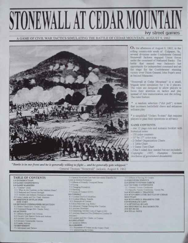 Stonewall's Sword: The Battle of Cedar Mountain is a two-player wargame on The Battle of Cedar Mountain, August 9th, 1862. One player commands Thomas "Stonewall" Jackson's Confederate troops and the other controls Nathaniel Banks' Union troops. Players win by controlling key areas of the map and by earning victory points by eliminating enemy units. There...