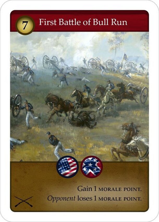 Card Game for 2 Players. American Civil War Theme. Players share a common deck with cards usable by both or just 1 specific player. Win by Reducing your Opponents Morale to zero. The North can win by taking Strategic Objectives. The South can win by timely play of certain Political Recognition cards. Cards portray specific Leaders (Lee, Grant), Battles...