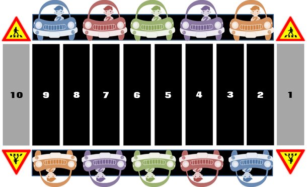 In Crosswalk players try to get the highest score after three rounds by moving their pawns (pedestrians) back and forth across the crosswalk. A four player game The crosswalk contains ten spaces marked from 1-10 moving east to west. You will need 40 cards in four colors (Red-Blue-Green-Yellow) and numbered from 1-10. Use four cubes, meeples, or pawns in...