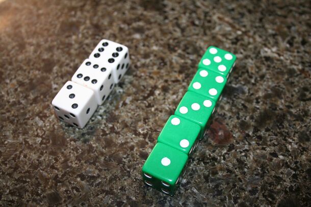 A two player (with solo variant) dice game of pushing your luck, and out-guessing your opponent. Players take turns scoring by making runs (1,2,3,4) or matches (2,2,2,2,2) on their die rolls, while trying not to have their points stolen by their opponent's secret number. Players only need eight six sided dice and the free rules to play this quick game. A...