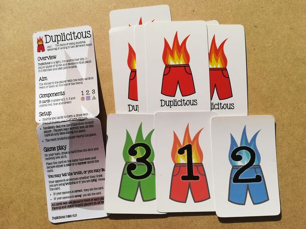 Duplicitous is a light, simple, bluffing game of truth and deception for 2-players that plays in 5 minutes and uses only 9-cards. Each player is dealt 1 card and a common deck of 7 cards is setup. On a turn the start player draws a card and announces the card to be either a colour or number. Their opponent must determine if they are telling the truth or if...