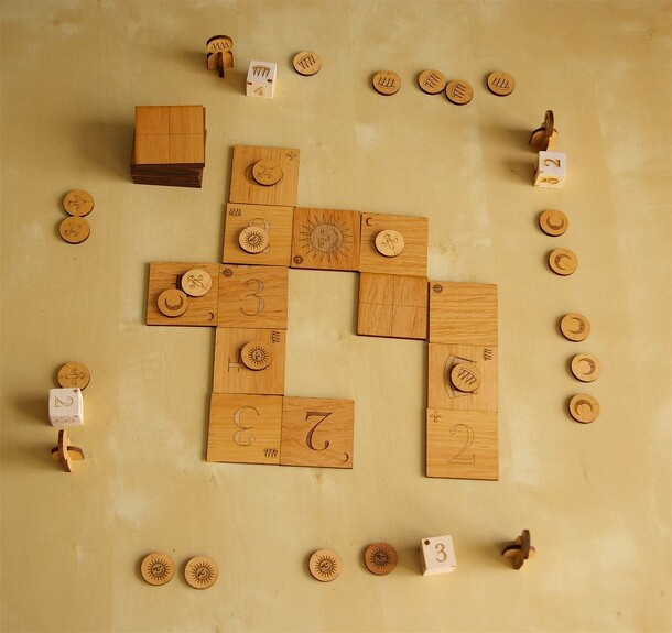This piecepack game has two phases: First all the players build a dungeon by placing rooms, monsters and items. They may also use their turns to power their hero up, as only the most powerful hero will enter the dungeon. When the dungeon is ready, the most powerful hero (in case of a tie, there's a small auction) enters the dungeon and plays a mini Dungeon...