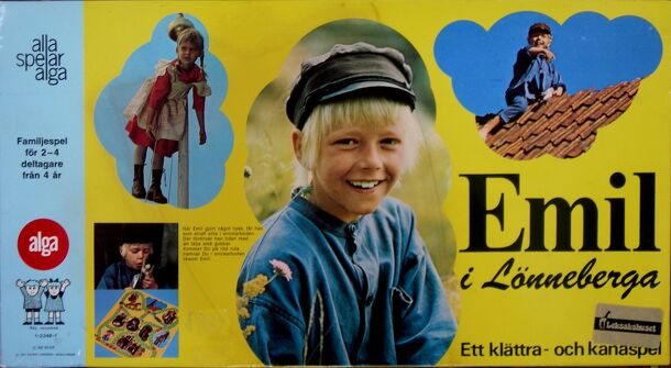 Based on the books by Astrid Lindgren, players are Emils and, as usual, are up to all kinds of mischief on a daily basis. They move on the board by rolling the die and if caught (landing on a red mischief space) they get grounded in the snickarboden (wood shed) in the center of the board, and have to carry on from there on their next turn. First to reach...