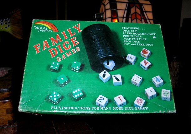 FAMILY DICE GAMES is a plethora of dice games packaged together into one box. -Craps -Poker Dice -Put & Take -Bowling -Jack Pot -Liar's Dice -Ship, Captain, Mate & Crew -Twenty One -Aces -Sequences -Snake Eyes -Horse -King Nero -Down & Back -Strike Three The set features a Yahtzee style dice cup, a set of five multicolored poker dice, five multicolored...