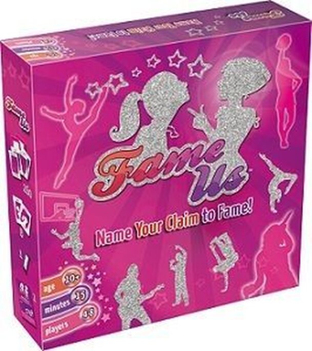In Fame Us, each player starts the game with six cards, with the cards bearing descriptive words or phrases like "tall", "blonde", "actor", "politician" or "mustachioed". On a turn, a player can either: Play a card to the center of the table. Ideally this player has someone famous in mind who matches all the descriptive cards now in play – but no names...