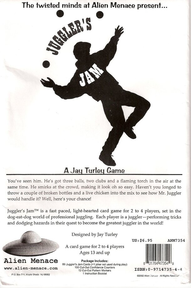 In Juggler's Jam each player is a juggler attempting to perform the best tricks. All actions are based on "confidence" points. You need confidence to play tricks and place new items into your juggling pattern and you gain confidence at the start of each turn by adding the values of tricks and objects you have in your "pattern." Other jugglers are trying to...