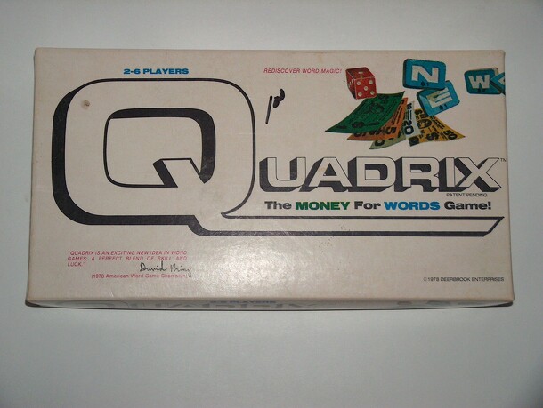 Quadrix - The MONEY For WORDS Game "Quadrix is an exciting new idea in word games; A perfect blend of skill and luck" David Prinz (On Box Cover) From the Rules: The object of the game is to win money from other players through the use of word-building skills. You can make money in four ways: (a) By completing legal words on the word board through placement...