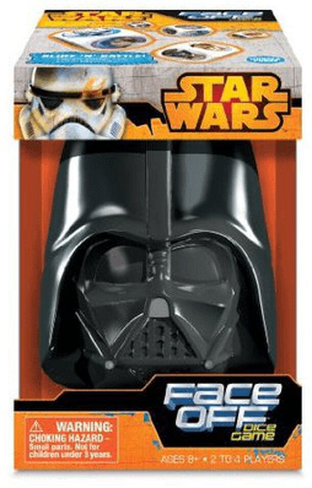 This is a push-your-luck dice game. The game contains a molded plastic dice cup/container molded to show the image of Darth Vader and Luke Skywalker, five identical dice (each with the image of Star Wars characters, four heroic and two villainous), as well as a short rules booklet. Players roll the dice, then can choose to "Go Hero" or "Go Villain"....