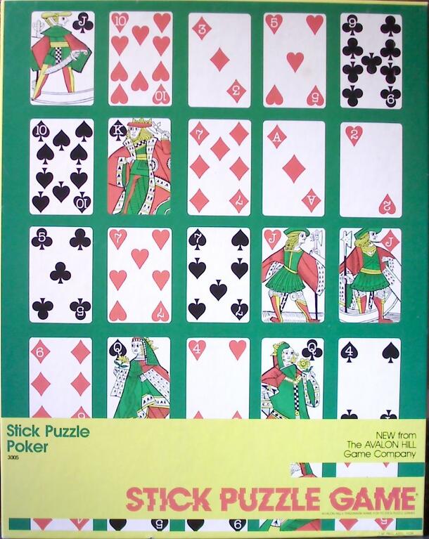 "Stick Puzzles" were a short-lived experiment similar to jigsaw puzzles but composed of two-sided, rectangular cardboard sticks rather than the traditional interlocking pieces. Most of these were simply pictures to assemble, but one was also a game. Stick Puzzle Poker, in addition to being a puzzle where each side shows a different set of ten poker hands...