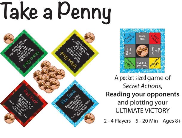 Take a Penny is played over a series of rounds in which players will secretly choose 1 of 8 actions from the their action card. After all players have made their selections, everyone will reveal their chosen action simultaneously and proceed to resolve them in order. Players cannot take the same action in consecutive rounds which adds to the strategic...