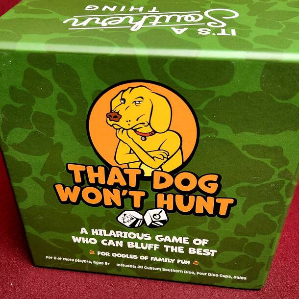 This is a hilarious game of WHO CAN BLUFF THE BEST with a Southern twist! "A little fibbin' goes a long way!" To win a round of That Dog Won't Hunt - you have to be the best bluffer - or be really darn lucky. If you're the only one left with a dice at the end of the game - you WIN! Liar's dice with a Southern twist - the dice are our own design with Bless...