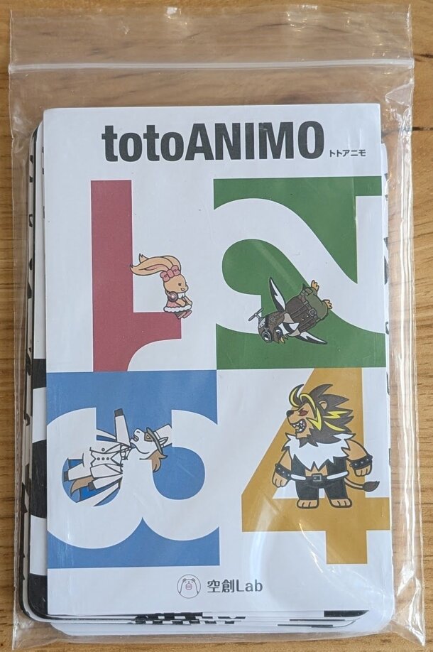 totoANIMO is a 2 plyaer mind game. Players have five cards numbered 1 to 4 and four win, lose or draw cards. The number card is first put out face down. Next, the card that predicts the winner of the game is then played face down. When both players have played their cards, they first turn them face down in numerical order and score a point if their...