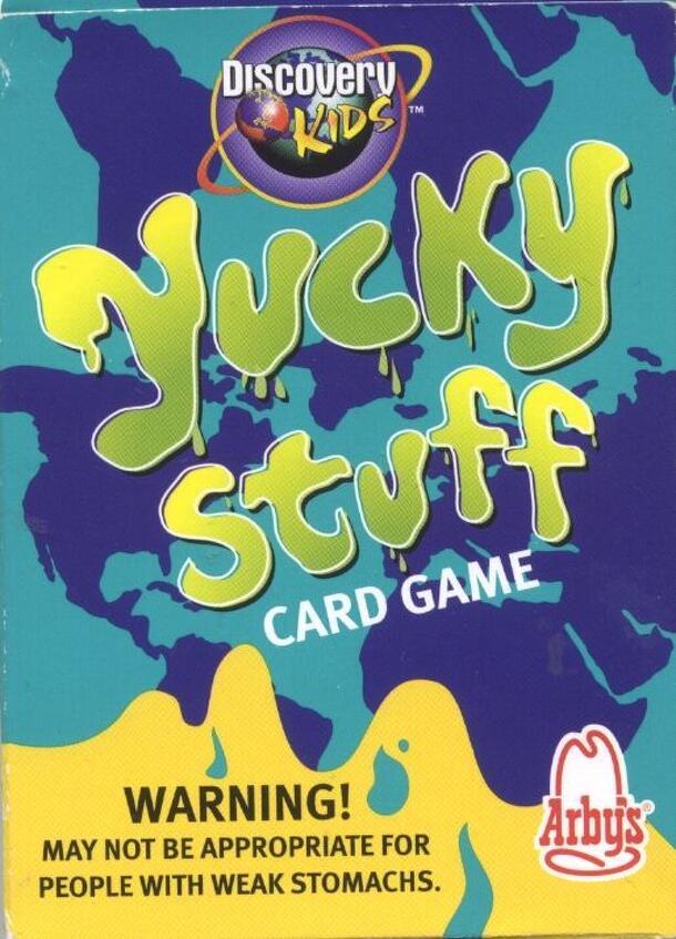 WARNING! May not be appropriate for people with weak stomachs. Yucky Stuff Card Game: This is a deck of 30 cards by Discovery Kids that was given out at Arby's with the kids meal. There are 5 categories: Strange & Ugly (Blue), Beetles & Bugs (Green), Amazing Body (Yellow), Body Bugs (Red), and, Dirty Devils (Purple). Each card has an item featured on it....
