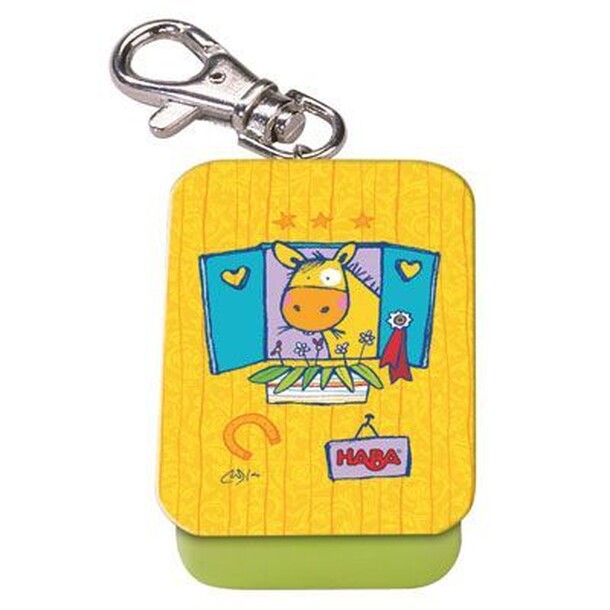 A HABA Minispiele key chain game simulating a horse race with two jumps. It contains 12 sticks, four circular tokens and two wooden horses. The four circular tokens are blank on one side. On the reverse, three of them have a picture of a clover leaf and one has a picture of a jump. On their turn, the player places the tokens in the box, shakes the box and...