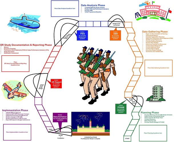 The game was designed for new and experienced Navy employees (adults) who haven’t done a study or have done a study, but not recently, are the primary learning targets. The game would be used in the office prior to starting an Efficiency Review Study. It can be played in a conference room or any room where a table is available. The object of the game is to...