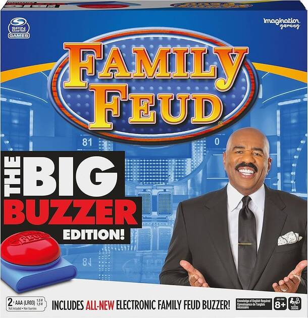 HIT THE BUZZER Just like on the popular TV game show, now you can “buzz in” to answer! Family Feud Big Buzzer Edition brings the speed and excitement of the game to your home. Includes 2 different sounds for different rounds. HUNDREDS OF SURVEY QUESTIONS Figure out the most popular answers to earn the most points in the Face Off round. Score even more in...