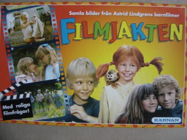 Children´s trivia game themed on the movies of Astrid Lindgren. The deck of movie cards is shuffled and one card is turned face up. Players roll the die and move their pawn on the board. This is divided into several squares, each with a picture from a movie based on a book by Astrid Lindgren. If your pawn lands on a square containing the same picture as...