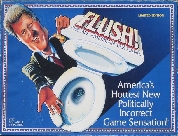 Flush! is a Clinton-era satirical trivia game about taxes and the IRS. Players roll and move along the board, which features caricatures of many of the most recognizable political figures of the early '90s (apparently, images of the board were sold as posters before publication of the game). Depending on the space, players pay taxes, fees, or penalties...