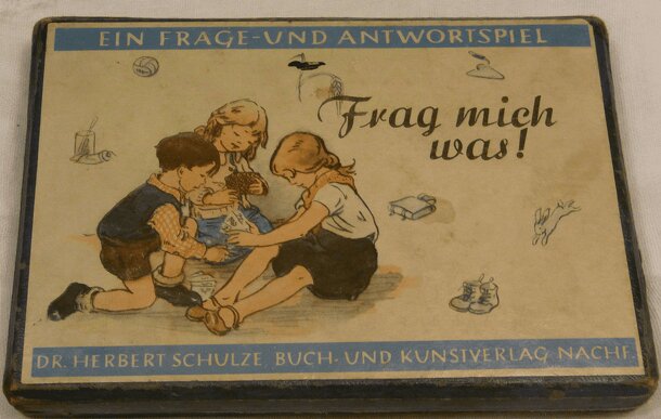 Objective: Gain most of the cards by finding correct answers The game contains 32 question cards (on rhyme) and 32 answer cards. The answer cards are distributed among the players. Players take turns drawing a question card. The player with the matching answer card must respond, otherwise each player may give the right answer gaining the card. Frag mich...
