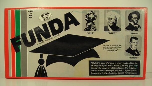 From the box "FUNDA, a game of chance in which you travel into the exciting history of Black America, earning your way through the University of Black Studies. The first player to earn an Associate Degree, Bachelor’s Degree, Master’s Degree, and finally a Doctorate Degree, wins the game." Players answer trivia questions as they travel around the board in a...