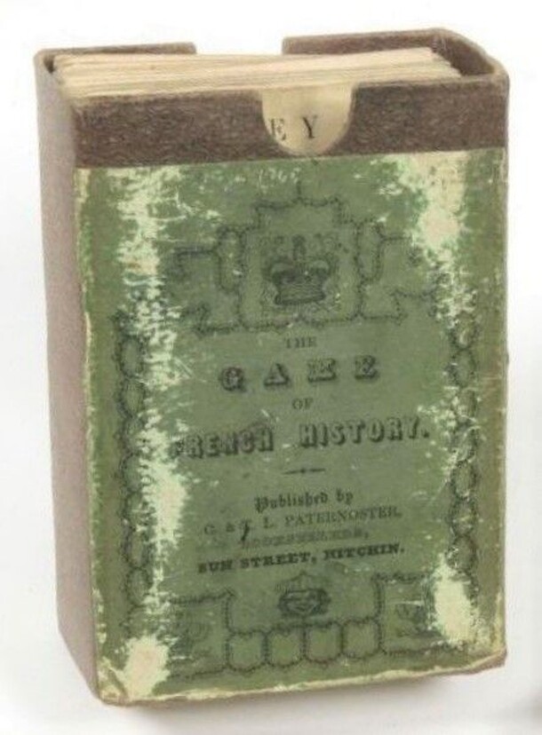 Game consisting of 80 cards. 36 cards represent monarchs. These show a woodcut portrait in an octagonal frame, and list numerous facts such as dates, names of parents and spouses, major events and people of their reign, and manner of death. 43 represent nobility close to the crown, and list facts without portraits. The 80th card gives the rules of the...