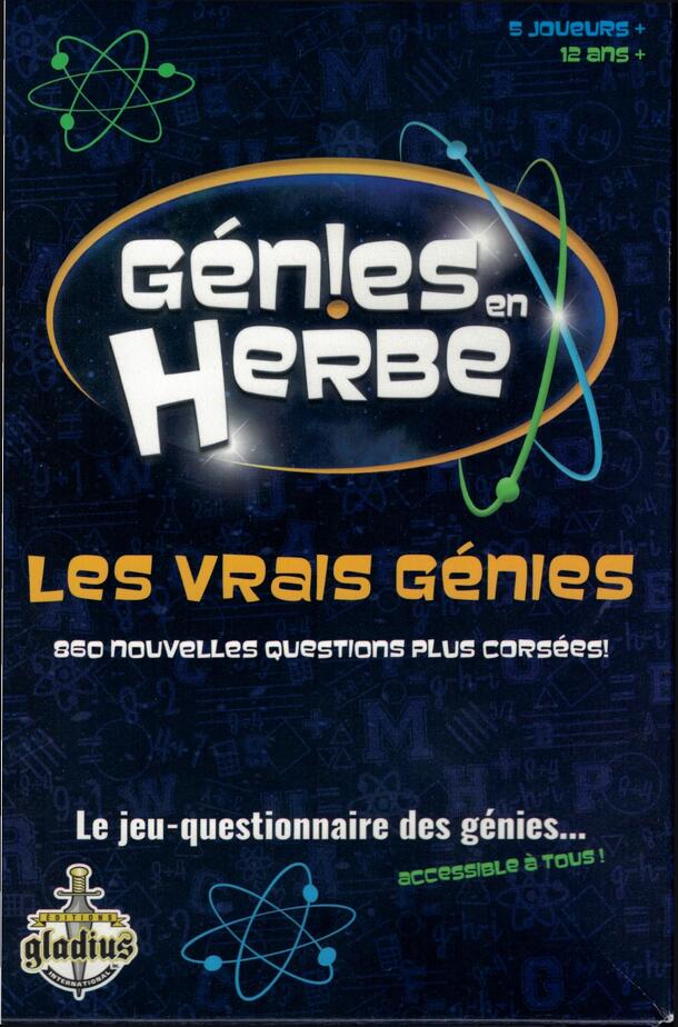 A trivia board game based on the popular TV show "Génies en herbe". (aired on Société Radio-Canada) Has many of the same mechanics of the TV show. Covering many fields of knowledge and containing over 3500 questions written by one of the TV judges. Content: 1 board game 1 black cards holder 6 divider cards 1 dice 1 Rulebook 1 box with 750 question cards...