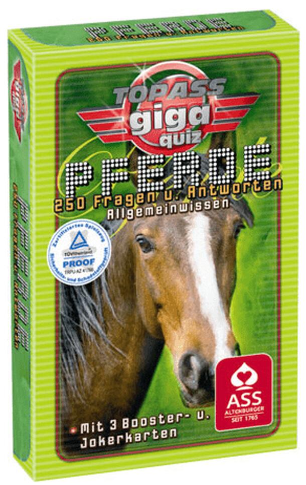 With over 250 questions and answers about horses, additional Joker and booster cards that affect the course of the game, provide games and guessing fun with the Giga-effect. There are questions one side and 4 variants another side of the card. Draw a card, ask a question and read the variants. Who bet the correct answer scores a point. Winner is the one...