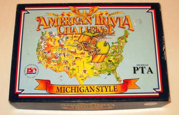 Great American Trivia Challenge - Michigan Style Celebrates the Michigan Sesquicentennial 1837-1987 (c)Michigan P.T.A. with sponsorship by Apple and Pepsi "Be the first player or team to complete your logo puzzle after correctly answering questions at the six major category stops and return to Michigan for your final question." Includes board, trivia...