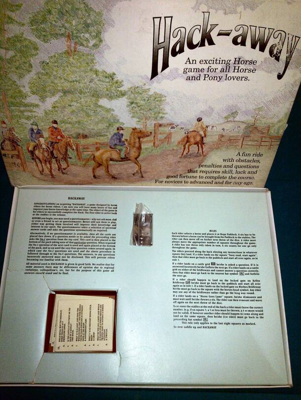 Hack-away is a roll and move game based on taking a pony on a hack through the country, with players sometimes having to answer questions about horses and horsemanship to avoid missing a turn or being sent back down the track. There are shortcut bridleways that can be used, but these are riskier routes and may mean the player goes back to the start....