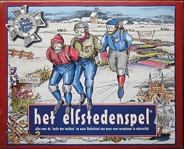 This is a game about the Elfstedentocht (Eleven Cities Tour), a 200-km ice skating race that leads through eleven different cities. Each player tries to win the race by being the first to reach the finish. Every turn, a player rolls a die and moves his pawn (a skater) as many spaces forward as the die indicates. Depending on the field where he ends...