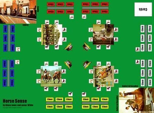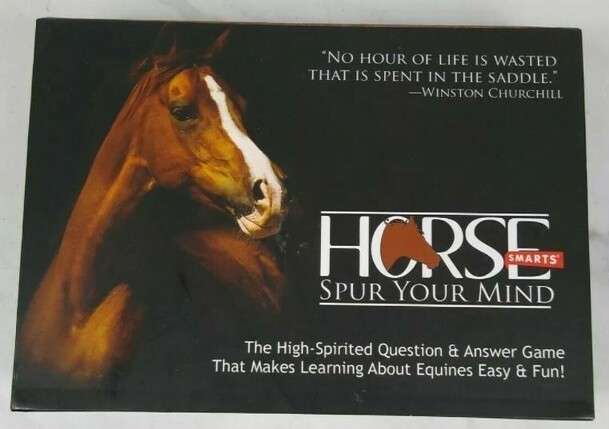 A trivia game about horses. The game board has two sides, a cross-country course and a steeple chase course. The game can be played on either side of the board, but the goal is always to finish ahead of the other players. Movement is decided by a combination of dice and answering trivia questions. The player is asked a question, and they add the dice value...