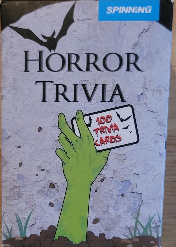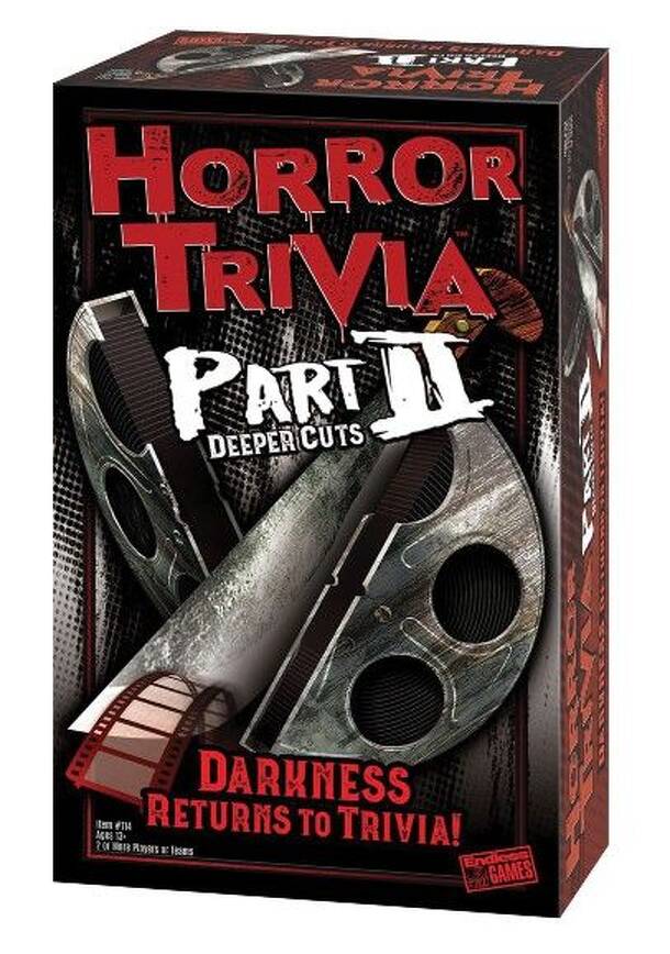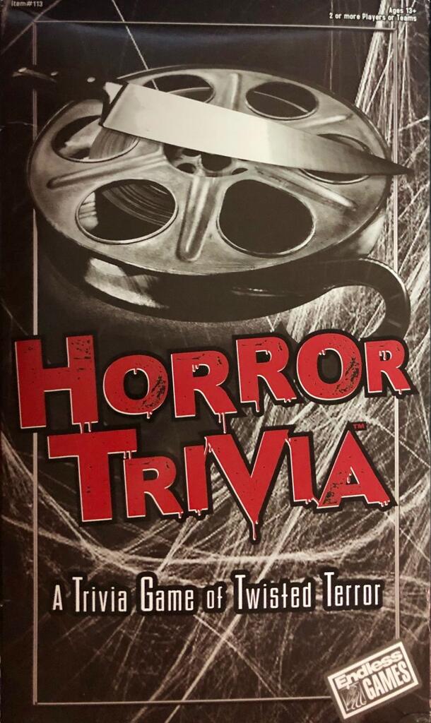 150 game cards, each featuring two horror film trivia questions (with answers on the back) and one of five weapon icons in the corner. A trivia question is read from the card and the currently active team attempts to answer. If successful, the next question is read and they attempt to answer it also. If both answers were correct, they collect the card....