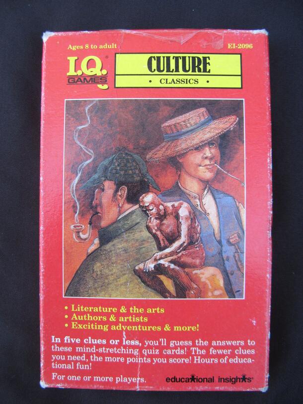 From the box: "Learn about the exciting, mysterious and adventurous world of literature and the arts as you play this fast-paced quiz game! Each card contains five clues. Answer on the first clue and you earn five points. If you answer after all five clues (including a picture clue), you still earn a point! The player with the most points at the end of the...