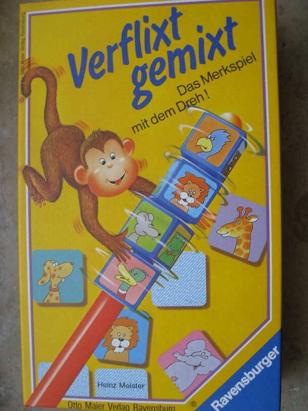 This is a simple Memory variant. There are 16 animal cards, one of each animal, and a "die staff" containing 4 dice. Each die can show 4 different animals. The aim of the game is to find all four animals in one game turn. A player turns the dice, and lays the staff down. It now shows 4 animals. The first player may now reveal 4 cards to try to find these...