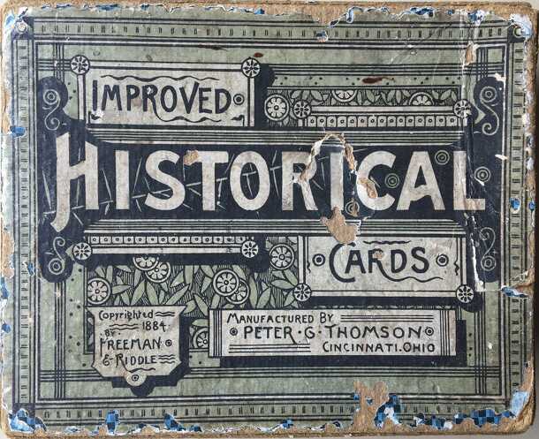 This is an 1884 trivia card game focused on American history. As with most such games, players are dealt an initial hand, and on their turn, ask a question of their neighbour to the left. If that person answers correctly, he keeps the card; if not, other players in turn have an opportunity, and if no one can answer, the questioning player keeps the card....